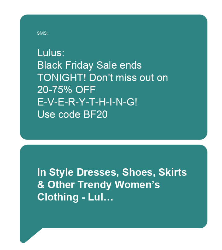 The message read: “Black Friday Sale ends TONIGHT! Don’t miss out on 20–75 % OFF E-V-E-R-Y-T-H-I-N-G! Use code BF20.”