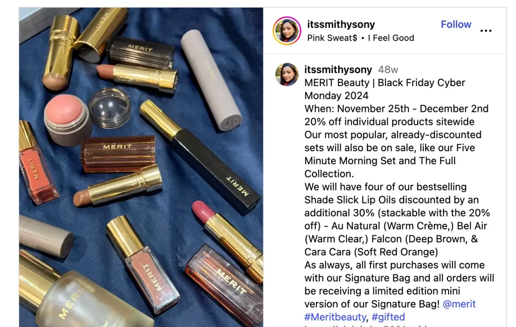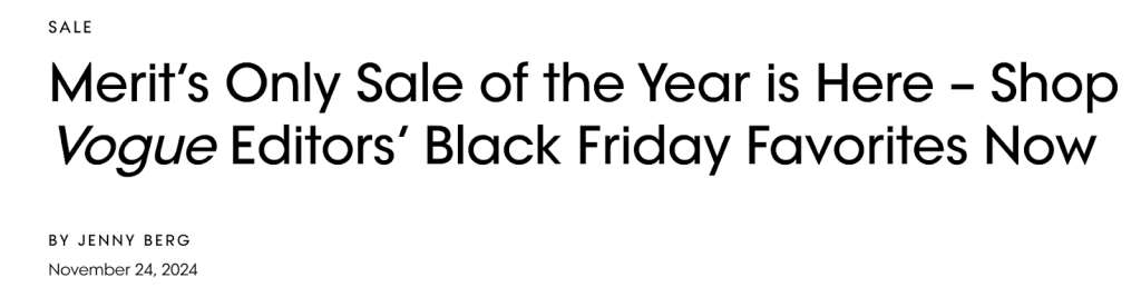 Merit Beauty began its 2024 Black Friday promotion (‘Merit’s only sale of the year’) on November 24, one day before the public sale window. The brand partnered with Vogue to distribute an exclusive early-access code (EAVOGUE) that unlocked 20% off site-wide.