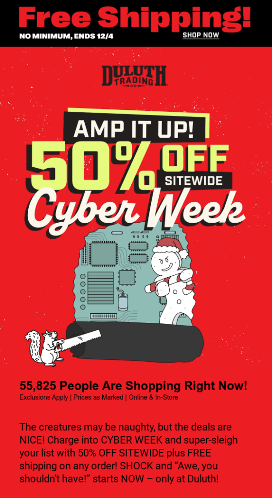 Duluth Trading Co. extended its BFCM offer into Cyber Week 2024 with a bold creative headlined “AMP IT UP! 50% OFF Sitewide.”