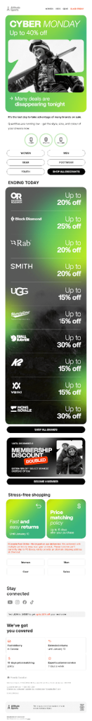- The bright color palette breaks the “Cyber Monday sameness” of black-and-gray visuals and keeps attention longer in crowded inboxes.