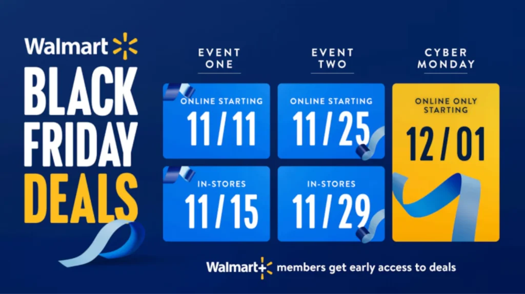 - Event 2: Began online Nov 25 @ 5 p.m. ET (in-store Nov 29 @ 6 a.m.). Walmart+ members accessed deals five hours early on Nov 25th (noon ET).
