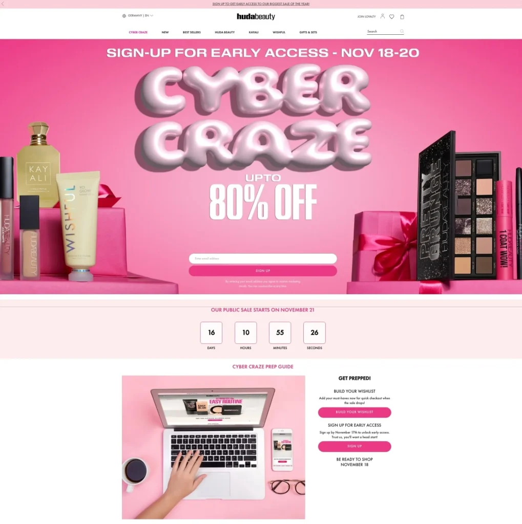 Huda Beauty used its “Huda’s VIPs” loyalty tier to promote up to 80% off for 48 hours and invited users to sign up for early entry before the public launch.