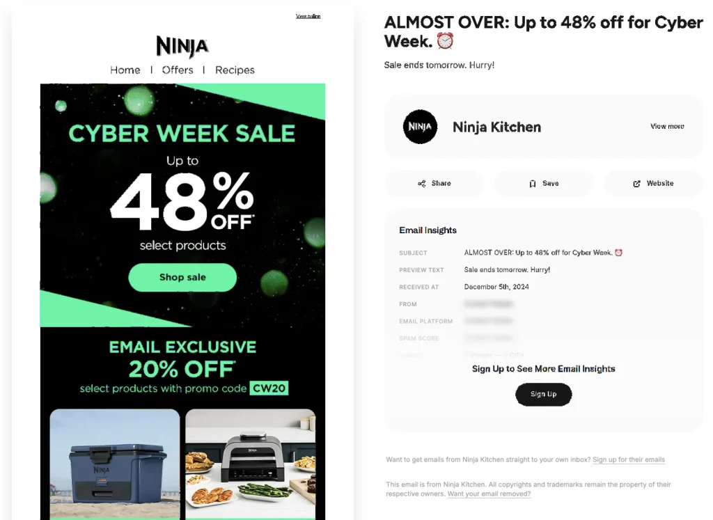 Ninja Kitchen sent a Cyber Week finale email on December 5th, 2024, with the subject line “ALMOST OVER: Up to 48 % off for Cyber Week ⏰.” This campaign closed Cyber Week with precision.