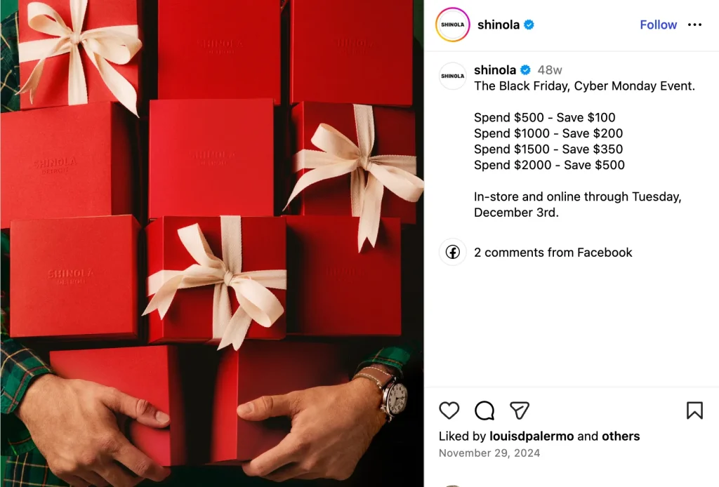It was publicly shared on Shinola’s Instagram and used in email and SMS to reinforce tiered incentives. It gave a deadline – Tuesday, December 3rd.