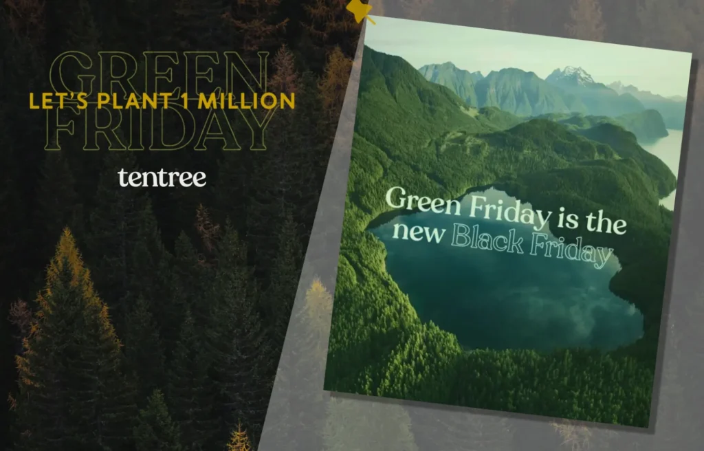 The Tentree Green Friday campaign combined an environmental mission with conventional sale elements, including sitewide discounts, complimentary shipping, and early access for loyal customers.