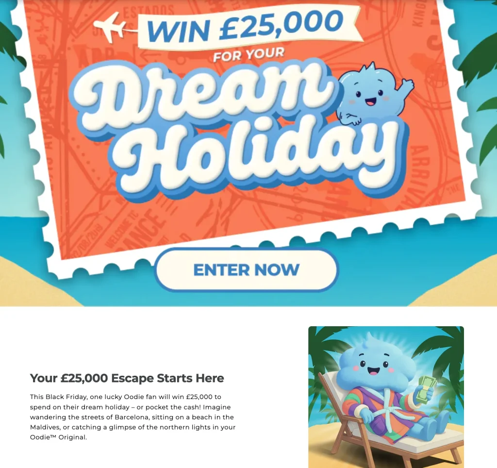 The Campaign: The Oodie launched an early Black Friday campaign starting October 1, with a chance to win £25,000 by spending and signing up for email/SMS.